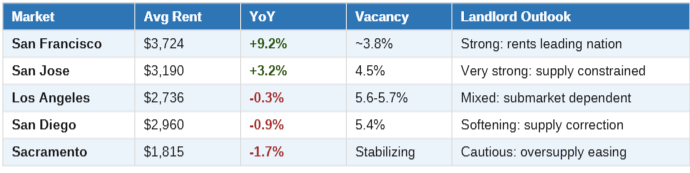 The table below summarizes current conditions across the five major California rental markets. The range of outcomes is unusually wide, which underscores why city-level analysis matters far more than state-level averages in 2026.