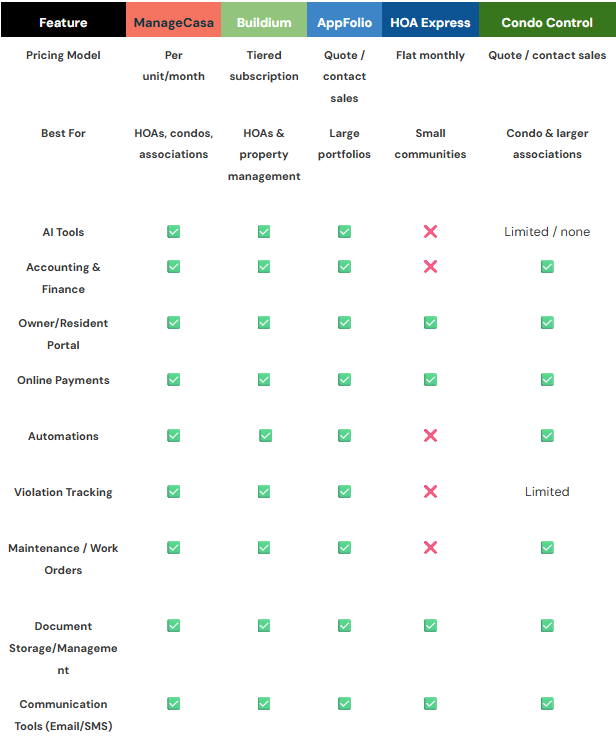 Cons: Starts at $67.50/mo (more than ManageCasa for small HOAs, close to Buildium Essential), quote-based above 50 units, steeper learning curve, accounting less intuitive than newer platforms, not ideal for non-condo HOAs