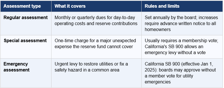 California is an exception for emergencies. Under Senate Bill 900 (effective January 1, 2025), boards can approve emergency assessments without a member vote when reserves are too low to restore gas, water, heat, or electricity. This exception is narrow. It does not cover deferred maintenance or general shortfalls.