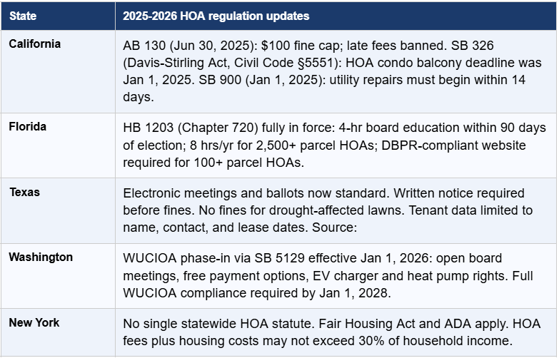 Key HOA regulation changes include California's $100 fine cap under AB 130, the HOA condo balcony inspection deadline under SB 326 (January 1, 2025), Florida's full rollout of HB 1203 under Chapter 720 requiring board education and website transparency, Texas codifying electronic voting and landlord protections, and Washington's WUCIOA phase-in from January 1, 2026 covering EV charger and heat pump rights.