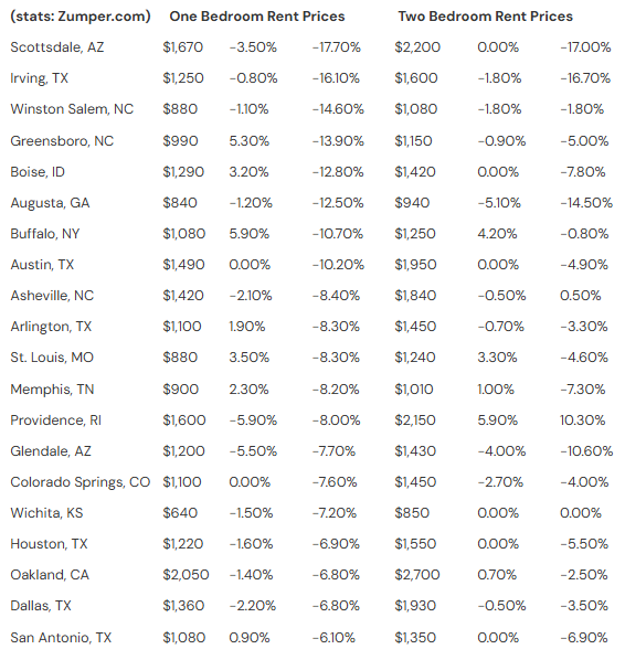 Major Metros with Largest Year over Year Rent Drops on 1 Bedroom Units