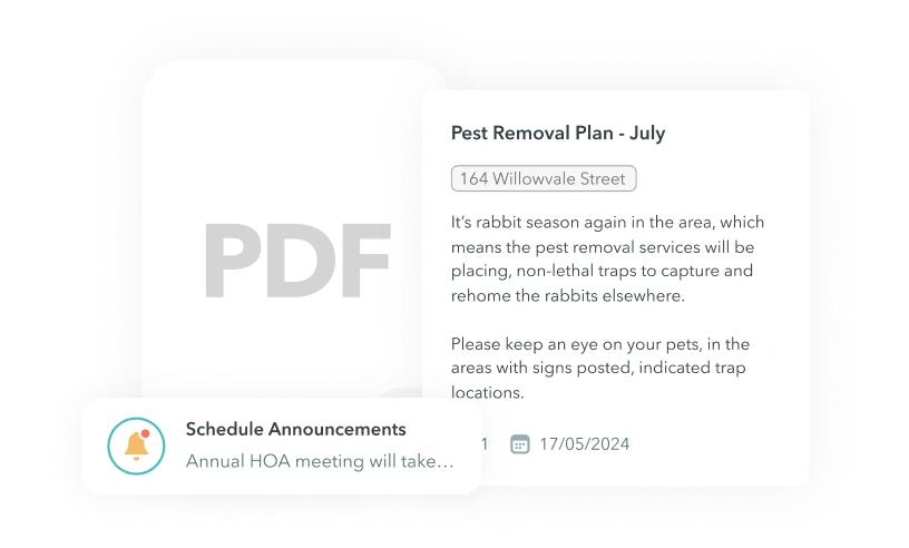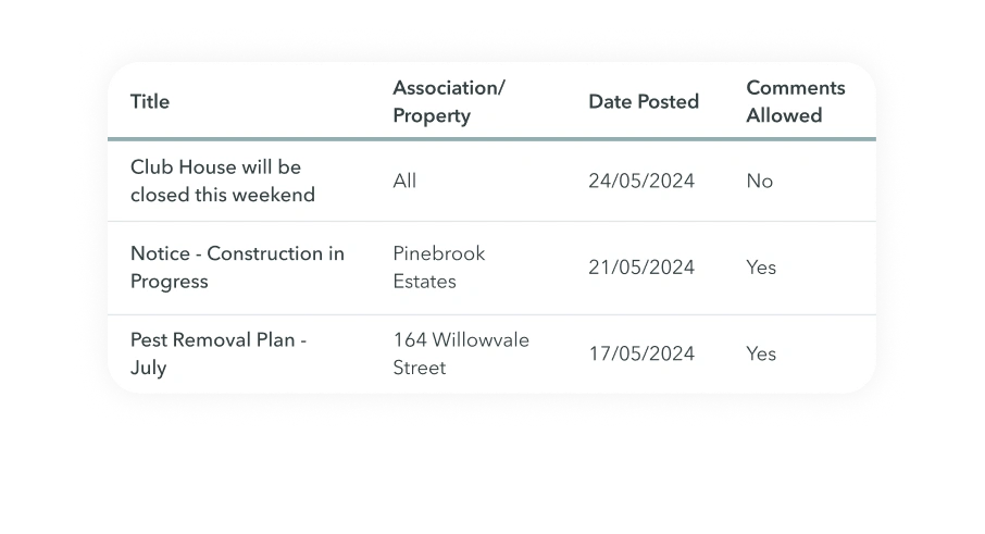 Post official HOA announcements where responses are not required. Ideal for community notices, scheduled work, or policy updates that need clear visibility without ongoing discussion.