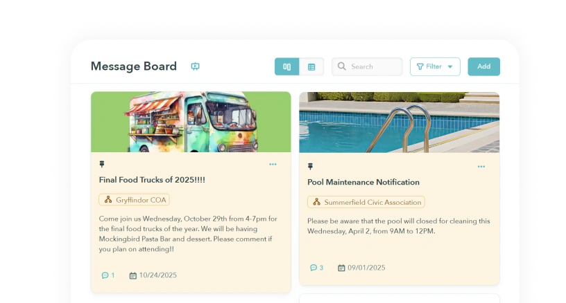 Message boards are only accessible to logged-in users based on their role. HOA communications stay private, controlled, and visible only to the appropriate audience.